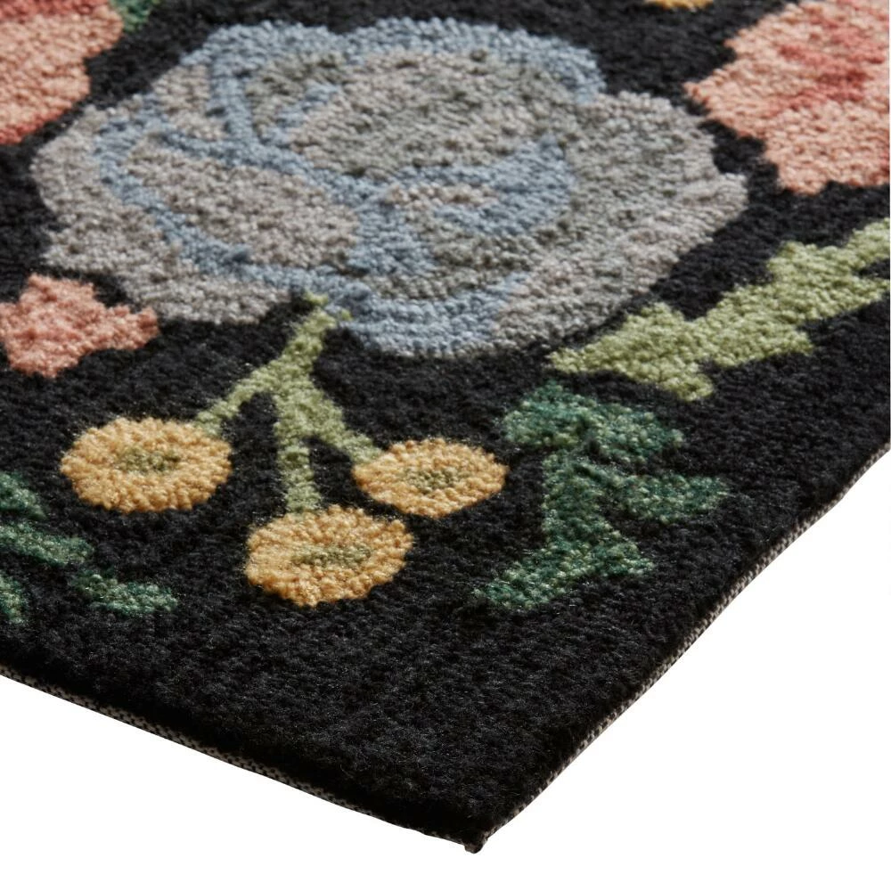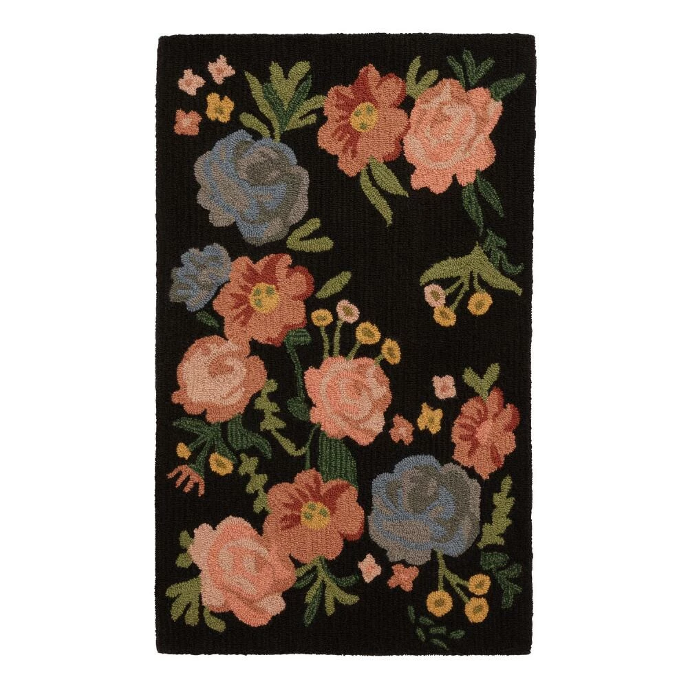 Hand tufted of easy-care polyester with a deep black background, this small area rug presents an artistic floral design in blush, blue, yellow and sage green. Expert artisans in India accentuate each floral motif with hours of hand carving, a technique that adds depth and dimension to the pattern’s bold visual impact. This whimsical scatter rug is perfect for entryways, kitchens, bathrooms and other small spaces.