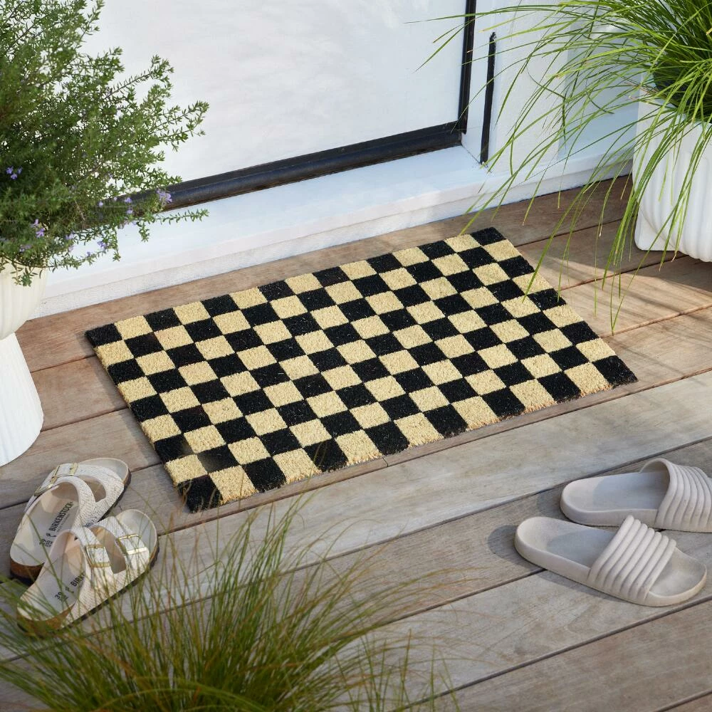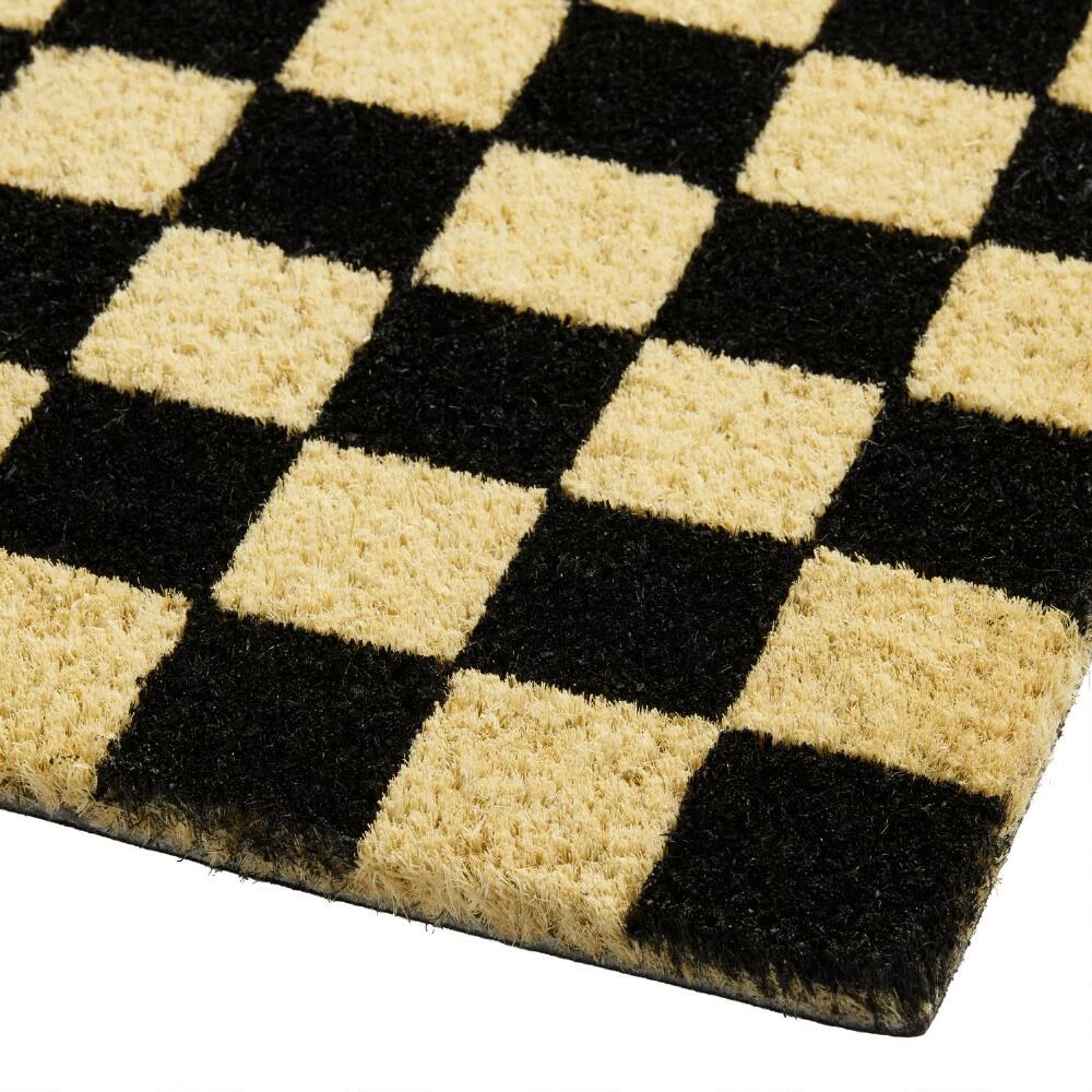 The black and natural checkerboard pattern of our exclusive doormat adds an on-trend look to your porch or patio in a durable coir fabrication. Tufted of natural coconut-husk fibers, this classic checkered doormat is built tough to handle foot traffic for the long term.
