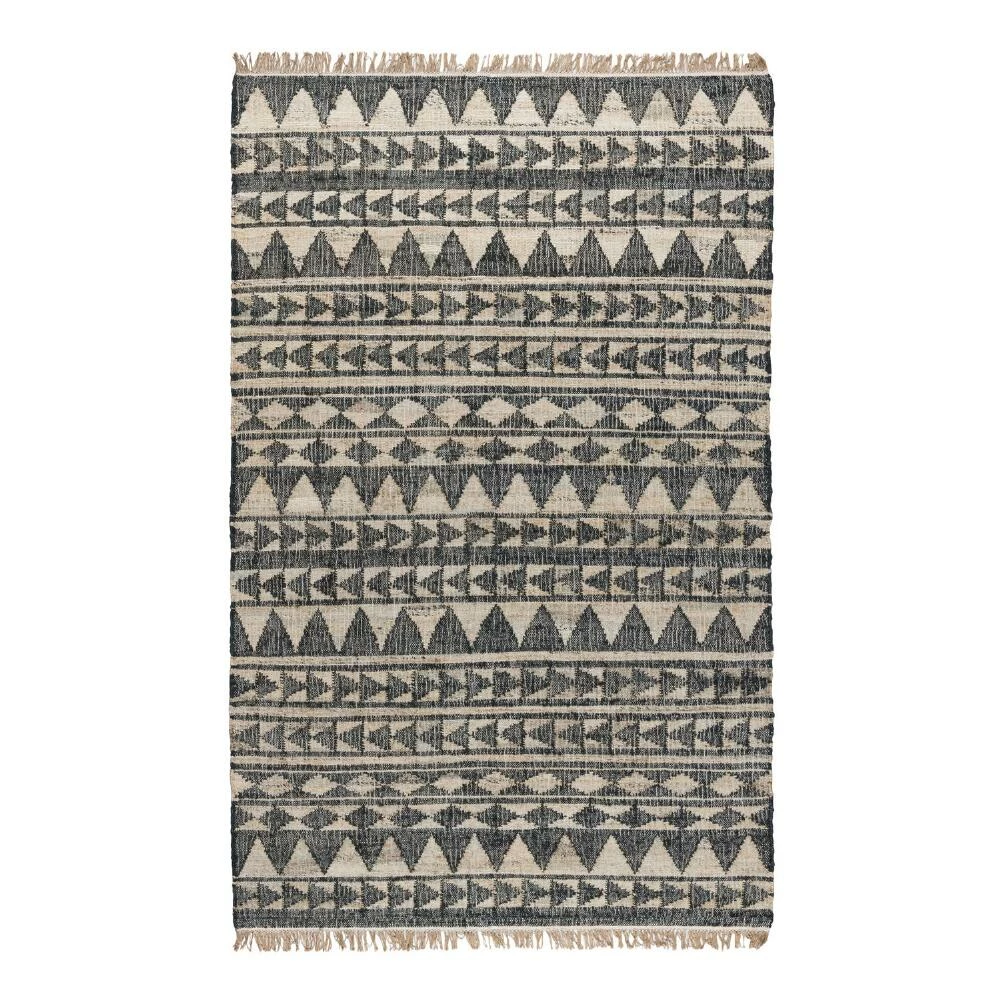 Handmade by artisans in India of natural jute and soft cotton, this flat-woven area rug features a geometric striped design in black and beige. Finished with dyed fringe, this sophisticated rug is a versatile accent for a wide range of decor settings.