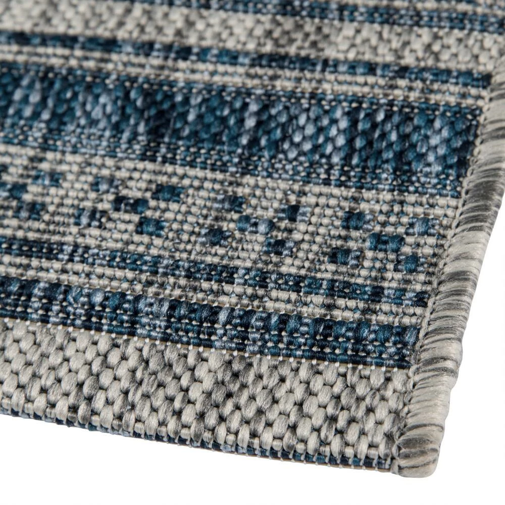Featuring a chic blend of geometric white stripes on a blue background, our flat-woven indoor-outdoor rug is a fun and refreshing mix of traditional patterns. Easy to clean, safe for pets and surprisingly soft underfoot, it’s a versatile piece that adds an eye-catching look to decks, patios, courtyards and other high-traffic areas.
