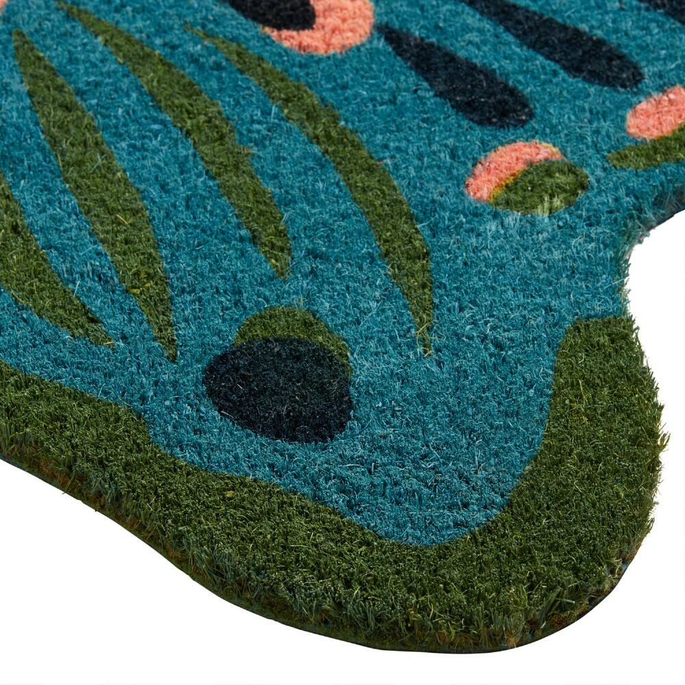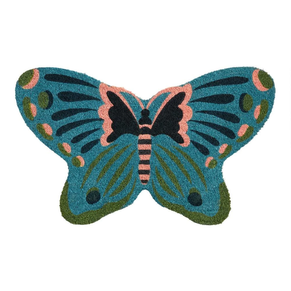 Cut and shaped into a beautiful butterfly form, this natural coir doormat is presented in a painterly palette of blue, pink, black and green hues. Its delicate artistry is bolstered by a durable coconut-husk fiber fabrication that ensures it stays tough after constant foot traffic without losing its brilliant colors. A PVC backing keeps its securely in place to greet family and guests with its vivid beauty.