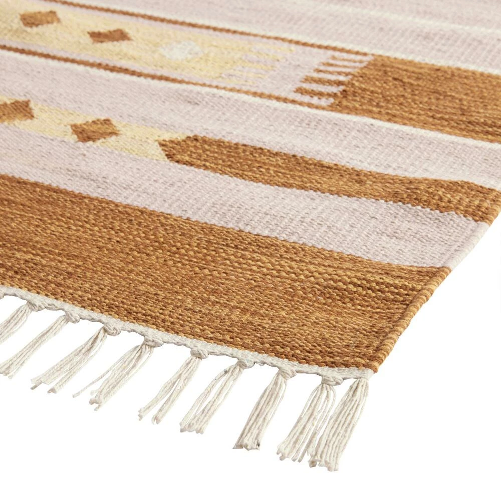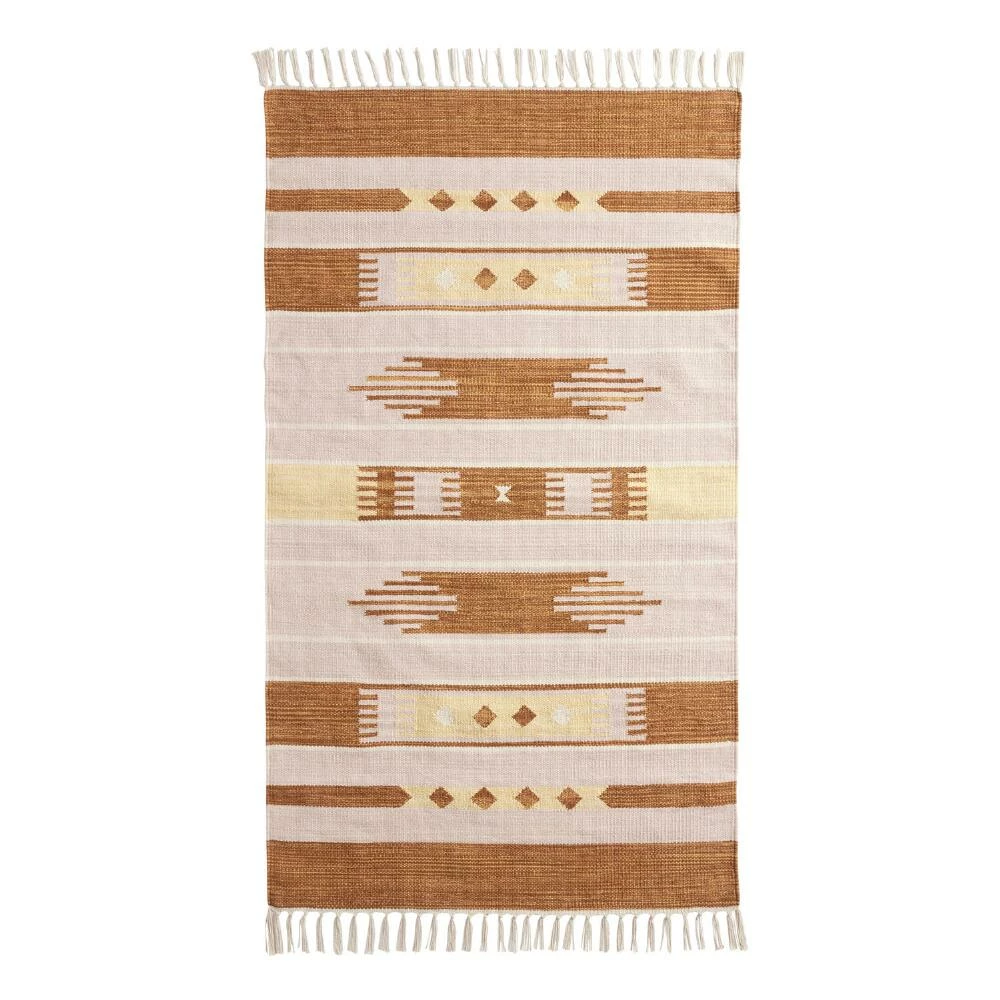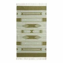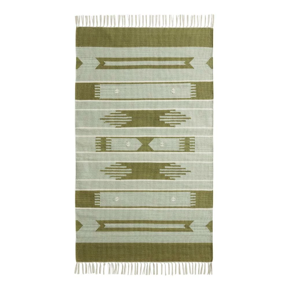 Woven of 100% natural cotton, this 3×5 area rug features a geometric design that makes a bold impact in your choice of lush sage green or rich terracotta shades. Finished with chic tassels, this fashion-forward scatter rug instantly updates kitchens, bathrooms, hallways or entries with its soft underfoot feel and unique mix of Southwest-inspired patterns.