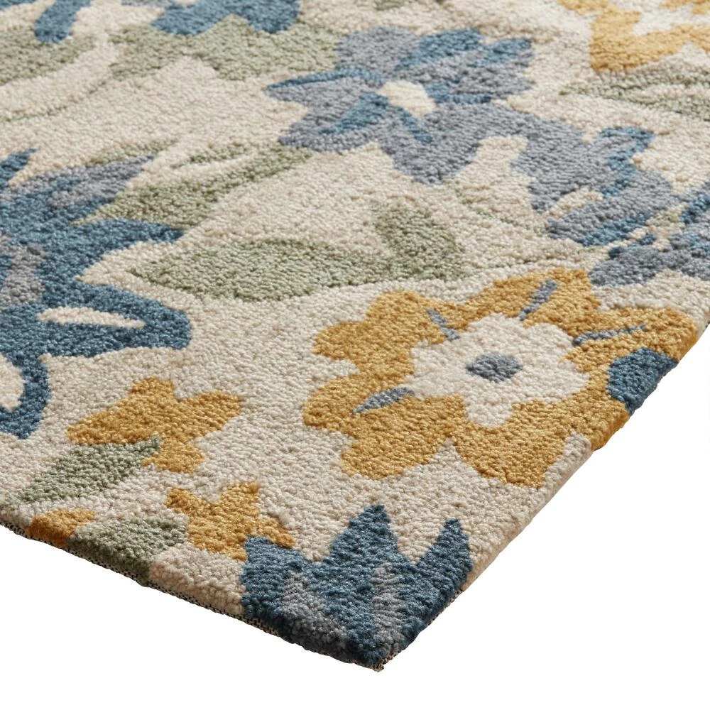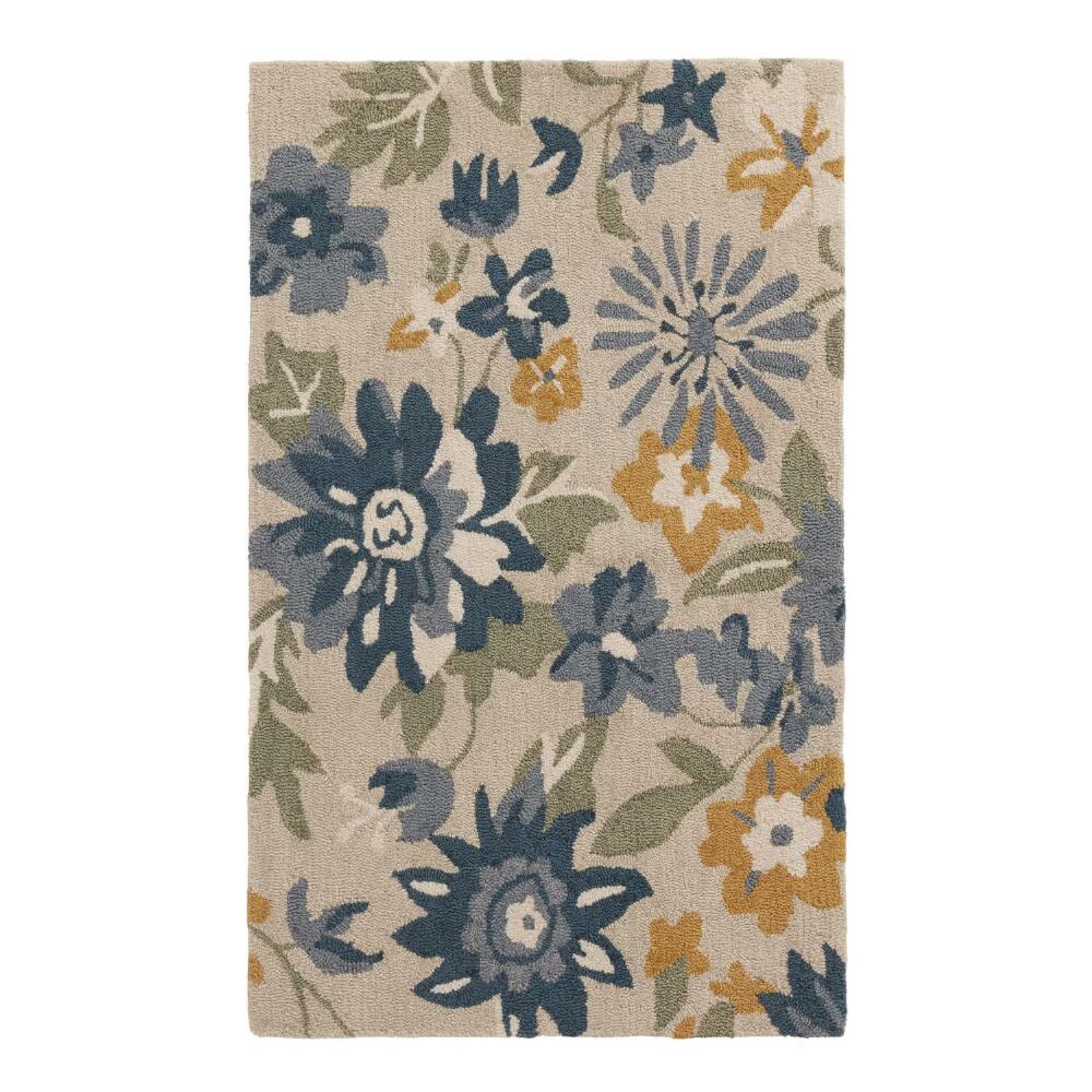 Hand tufted of easy-care polyester, this small area rug presents a whimsical floral pattern in a refreshing palette of green, blue, ivory and yellow. Expert artisans in India accentuate each floral motif with hours of hand carving, a technique that adds depth and dimension to the design’s bold visual impact. This petite scatter rug is perfect for entryways, kitchens, bathrooms and other small spaces.
