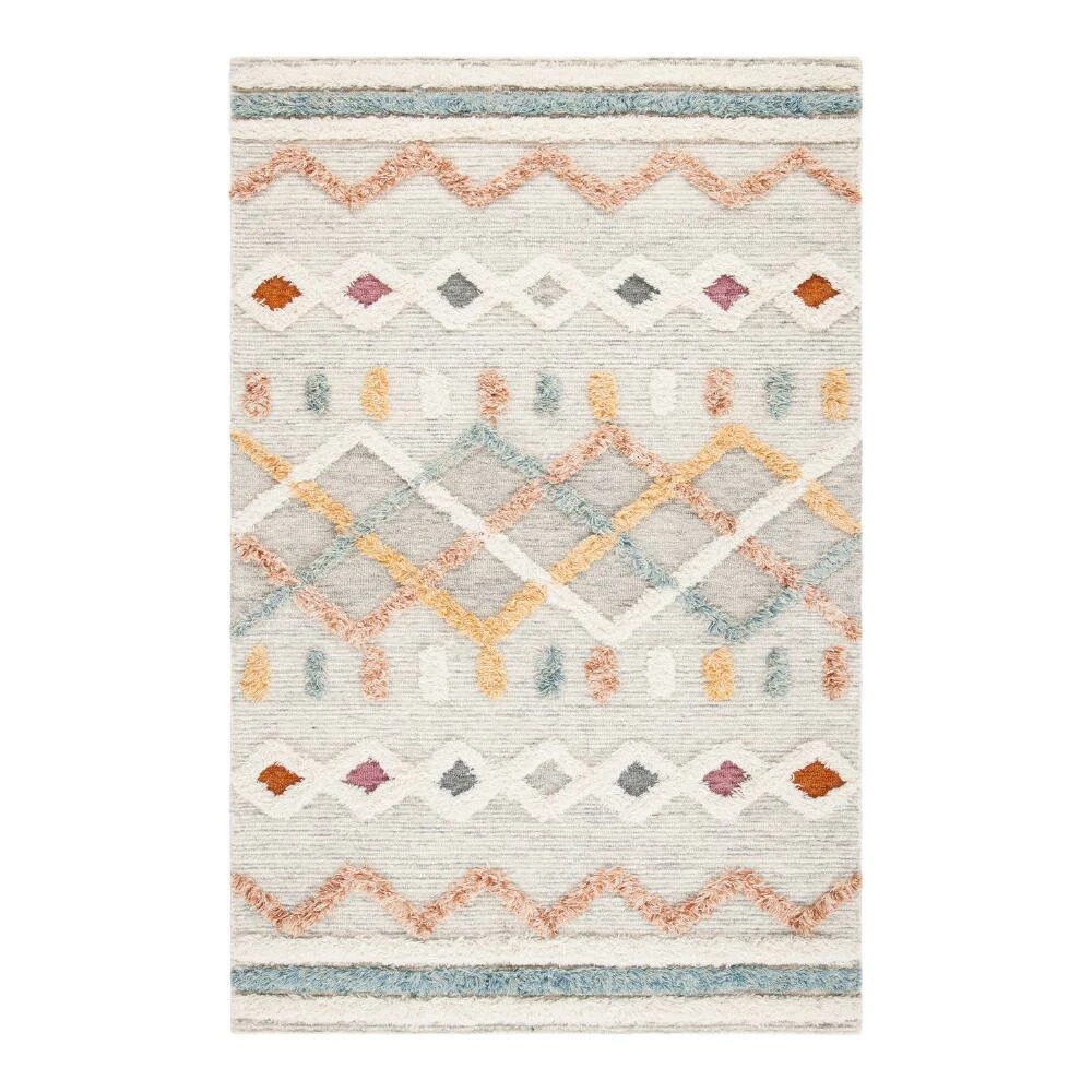 Hand-knotted of 100% wool by expert Indian artisans, this Logan area rug features a luxurious blue-multicolor design on a chic ivory background. Its layered assortment of diamond, zigzag and striped patterns are brilliantly overstitched of cut-pile wool yarns, creating a raised texture that feels warm and cozy underfoot. A dynamic centerpiece for any room, this sumptuous rug is an effortless enhancement for modern and contemporary homes.