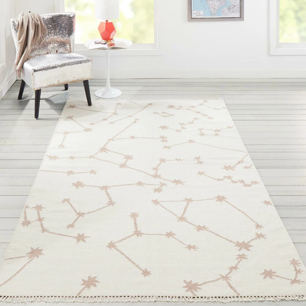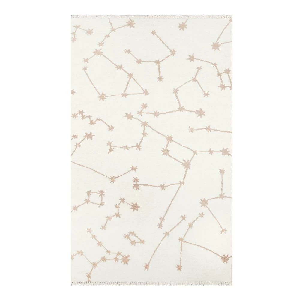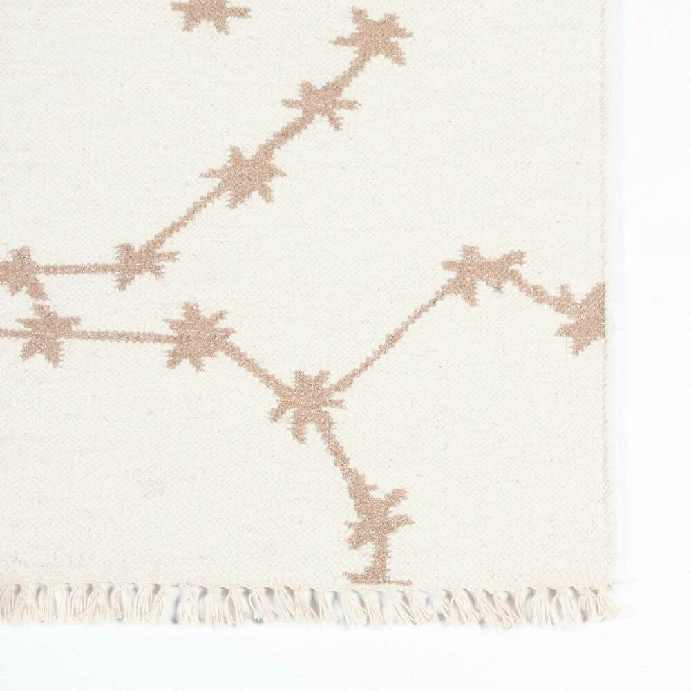 Lay out a stunning starry scene in your home with the celestial Emilia area rug. Handwoven by artisans in India of durable wool with a hint of Lurex in ivory and metallic gold tones, we imagine this decor piece bringing the wonder of the galaxy to a bedroom or playroom.