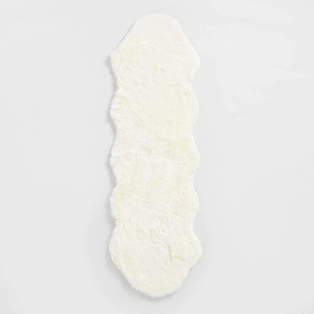 Plush and luxurious in ivory, our exclusive faux sheepskin area rug captures the soft and silky feel of New Zealand sheep’s wool in an animal-friendly fashion. Available in traditional and floor runner sizes, this sumptuous accent is perfect for the bedroom.