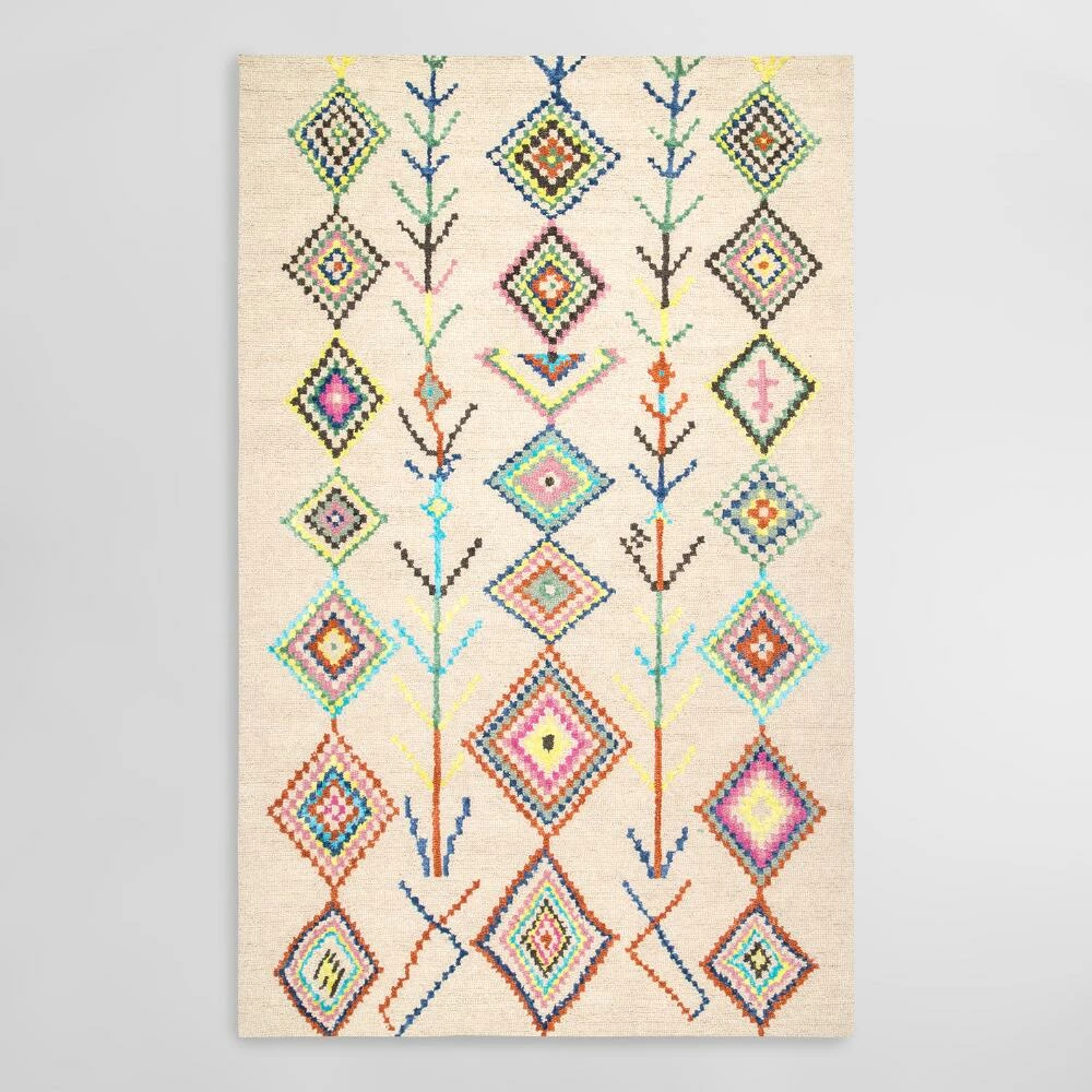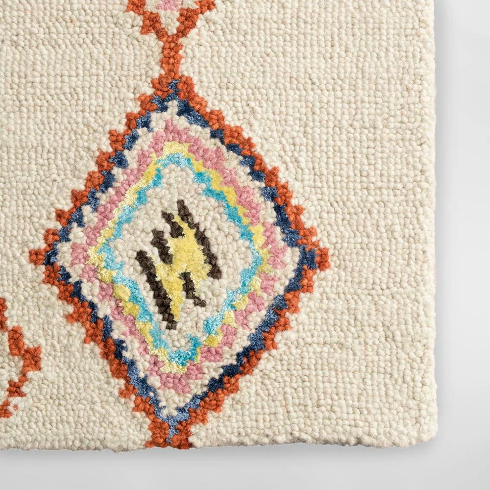 Hand tufted by artisans of India, this unique rug brightens any room with its lively Bohemian-inspired geometric patterns over a span of plush pile in an ivory hue.