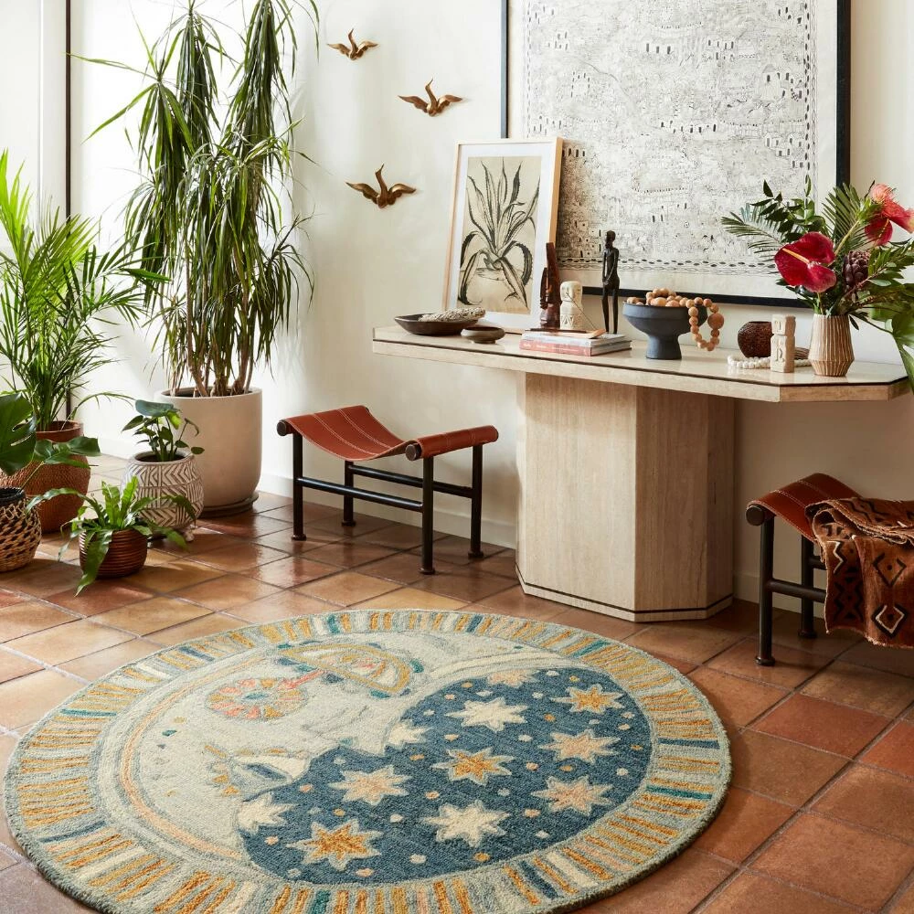 Celebrated for her rich colors, imaginative designs and bold boho style, Jungalow founder Justina Blakeney creates instantly iconic home decor. A collaboration with the masterful weavers at Loloi, the Ayo round rug is a celestial showcase featuring Blakeney’s wonderfully whimsical crescent moon and stars. Hand-hooked of 100% wool in a selection of colors and sizes, this alluring area rug adds a burst of personality to any room.