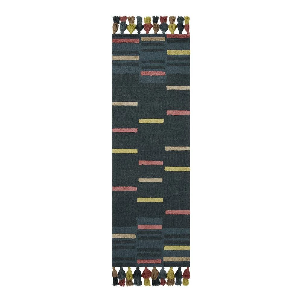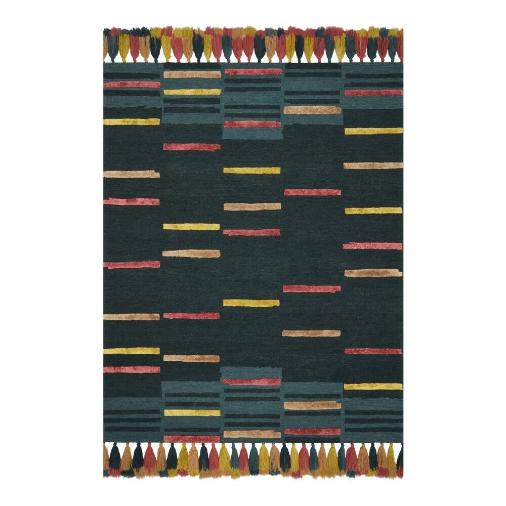 Famed for her bold boho style, Jungalow founder Justina Blakeney creates home decor embodying her belief that color has the power to bring great joy. A collaboration with the artisan weavers at Loloi, the exuberant Jamila area rug features sunset-hued offset stripes, a dark center giving way to teal ends and bright layered tassels. Hand-hooked of 100% wool, this eclectic rug is a striking addition to any room that’s certain to turn heads.