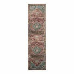 With its blanket-stitched edges and diamond motif in colorful shades of rose, burgundy and green, our Miramar rug is reminiscent of a prized Persian carpet. Made to withstand the rigors of everyday life, this rug is power-loomed from polyester yarns that will not shed or fade over time.