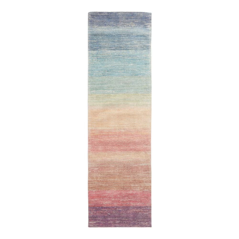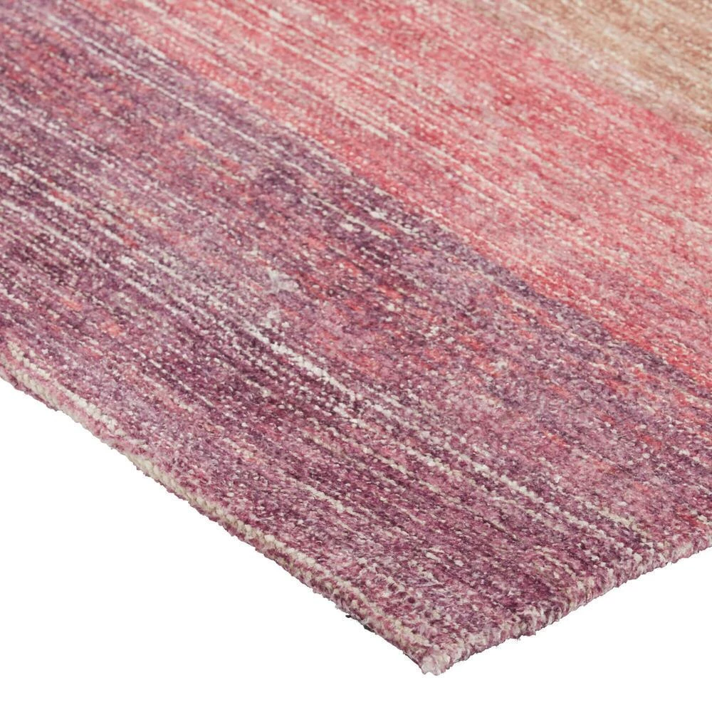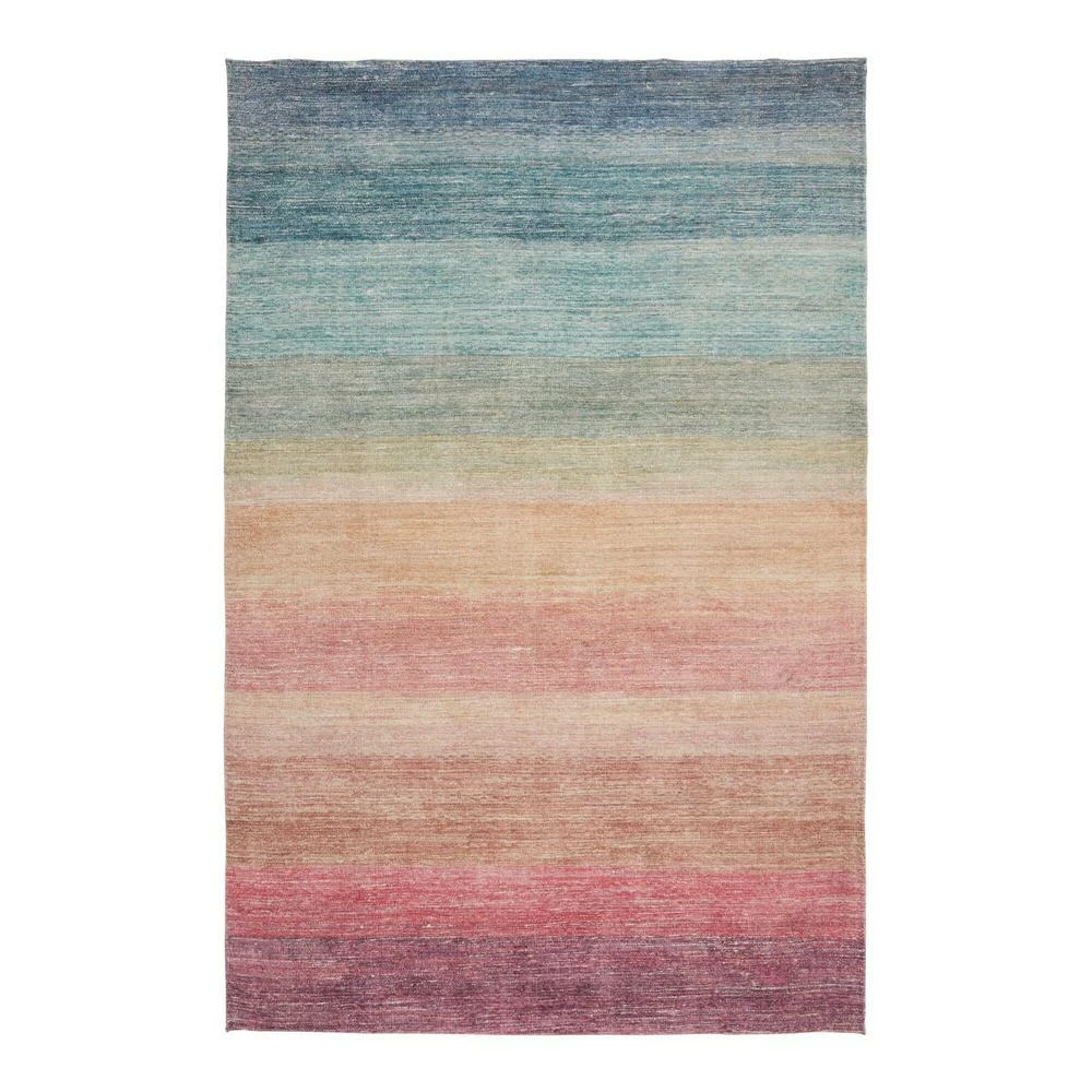 Crafted of silky viscose, soft cotton and durable polyester, our area rug features a gorgeous ombre rainbow of hues that blend and flow from cool to warm tones. An artful accent with a sumptuous feel, its colorful ombre stripes create a sense of movement as they flow from lighter to darker shades. This exclusive rug is perfect for adding chic color and visual impact to the living room or bedroom.