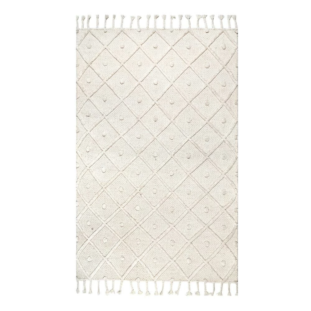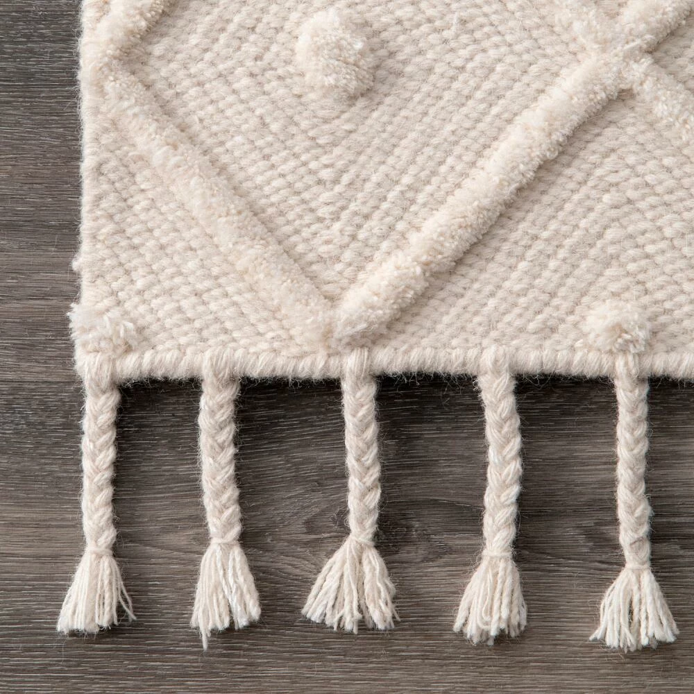 Fusing modern, raised diamonds and dots with a timeless texture-rich weave, each stitch of the Deandra area rug is hand-loomed by artisans in India. It’s crafted of a blend of wool and cotton for lasting durability with a pleasant underfoot feel. In a versatile off-white tone with tassels tracing the ends, we imagine this special decor piece softening an industrial apartment or adding extra coziness to a rustic home.