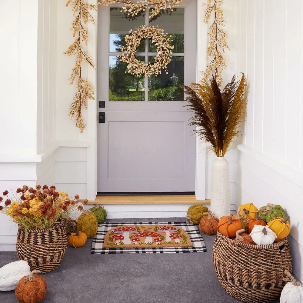 Spotted red and ivory toadstool mushrooms are arranged with sprigs of green on the natural coir background of our exclusive doormat. Featuring a curved shape to fit your entryway, this cute harvest welcome mat is ideal for layering with a small indoor-outdoor rug. With a durable coconut-husk fiber construction it will keep its vivid fall colors all season long.