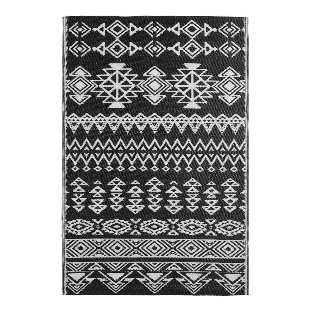 Featuring assorted Moroccan-style stripes in high-contrast black and white, our 4×6 Rio outdoor floor mat is durable, stain resistant and reversible. Woven with 90% recycled materials, its two-sided design provides double the wear on patios, balconies and decks. Elevating any space with its modern arrangement of vintage-inspired motifs, you can roll up this fade-resistant mat up for easy transport to the beach or park.