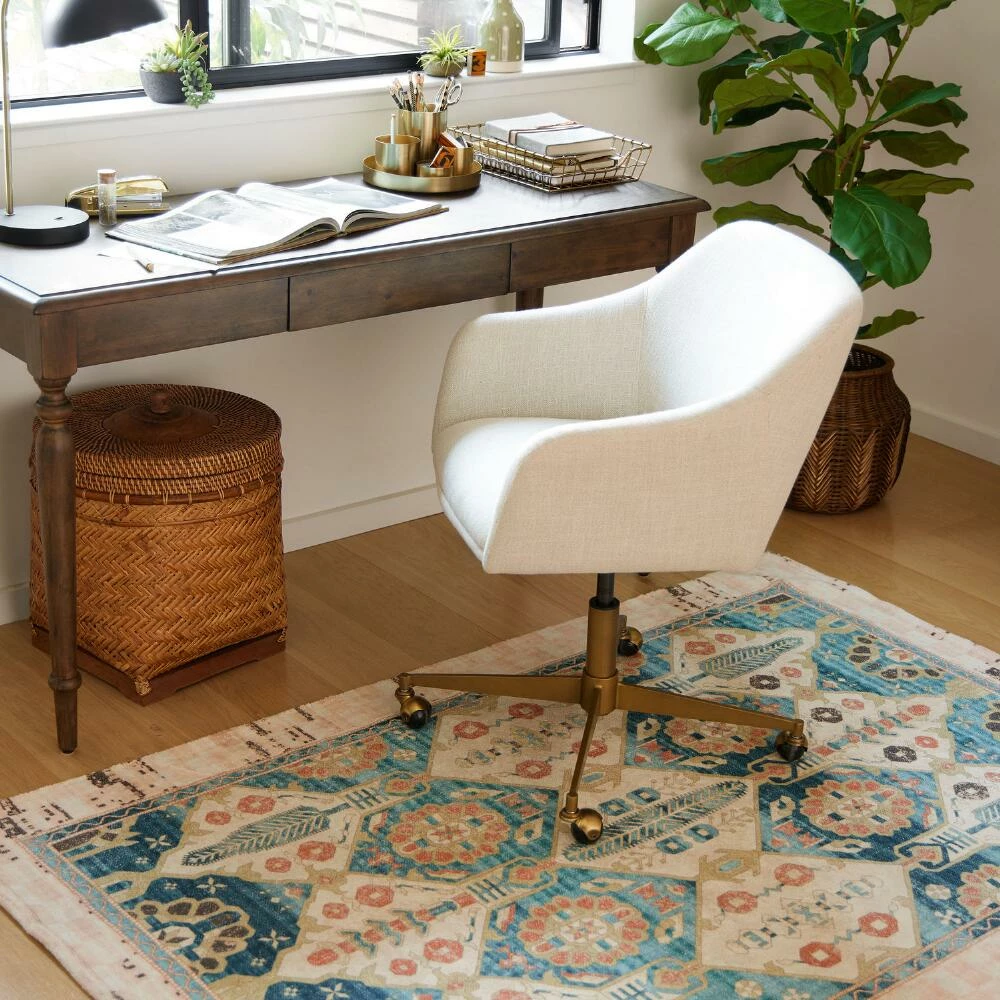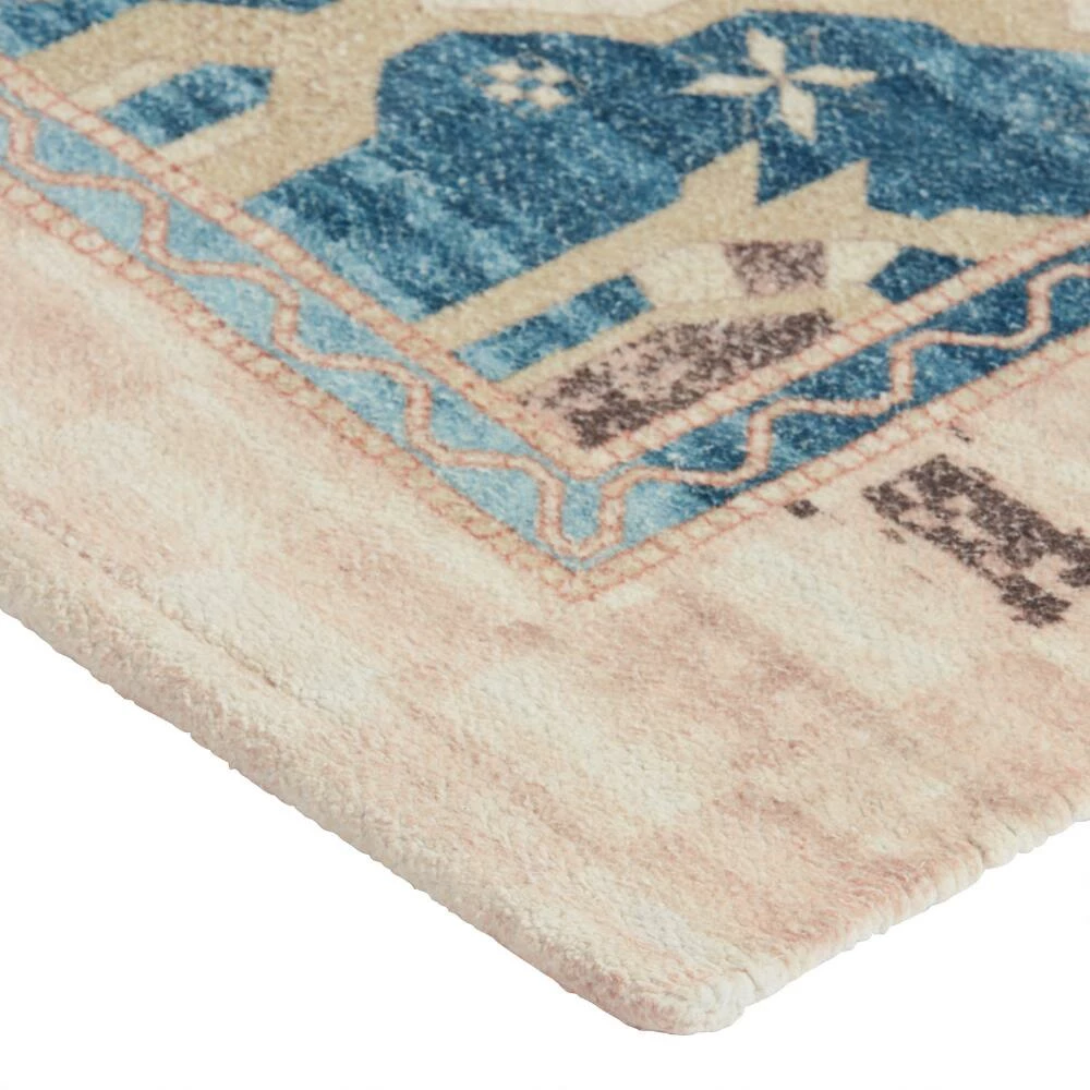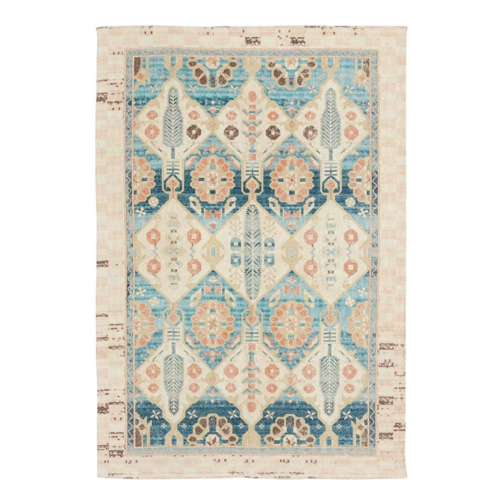 Handwoven of natural cotton with a distressed floral-medallion design, the Selma 4×6 washable area rug is a perfect high-traffic foundation for family homes. Its vintage-inspired patterns are presented in blue, terracotta and golden-yellow hues and framed by a gorgeous blush, ivory and brown checkerboard border. The ultimate easy-care rug for homes with pets and children, you can just toss it into your washing machine to take care of any mess.