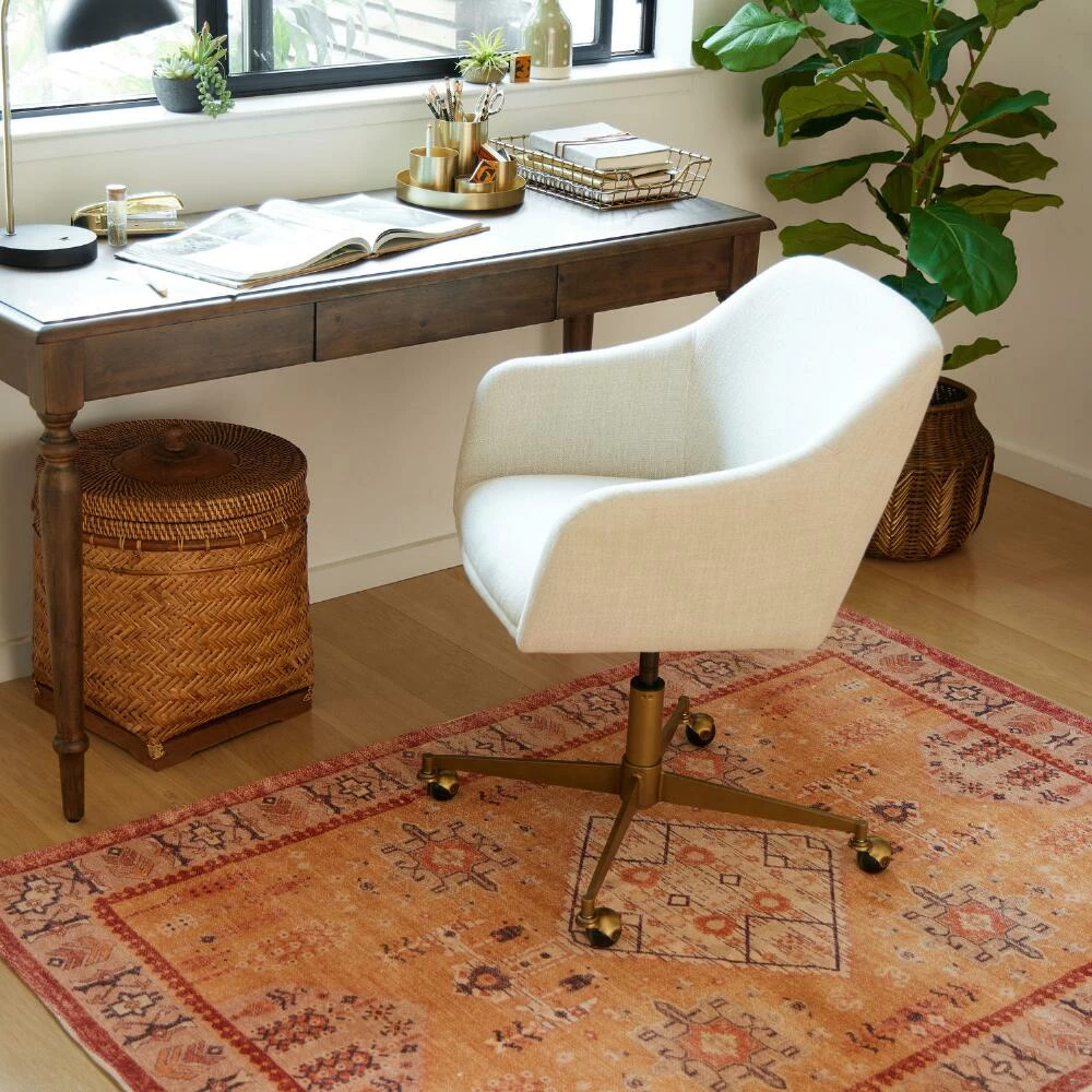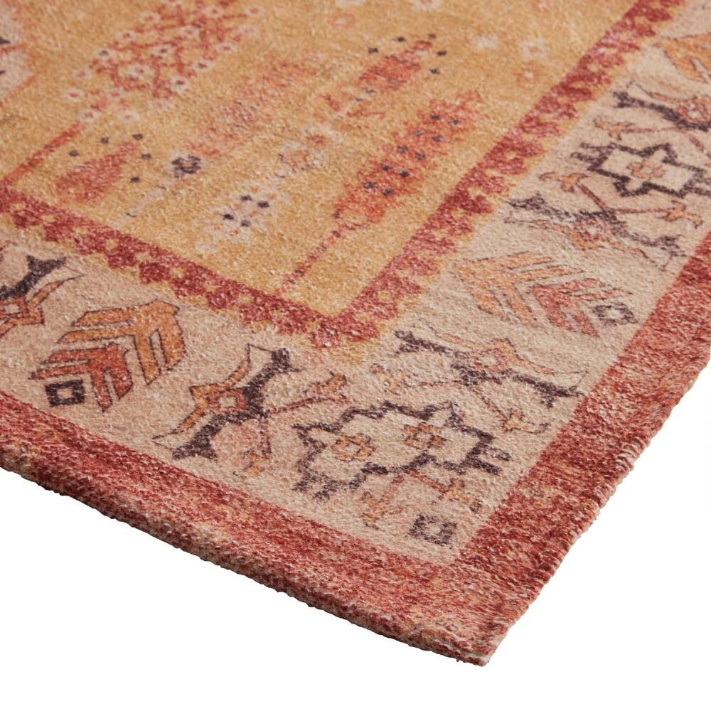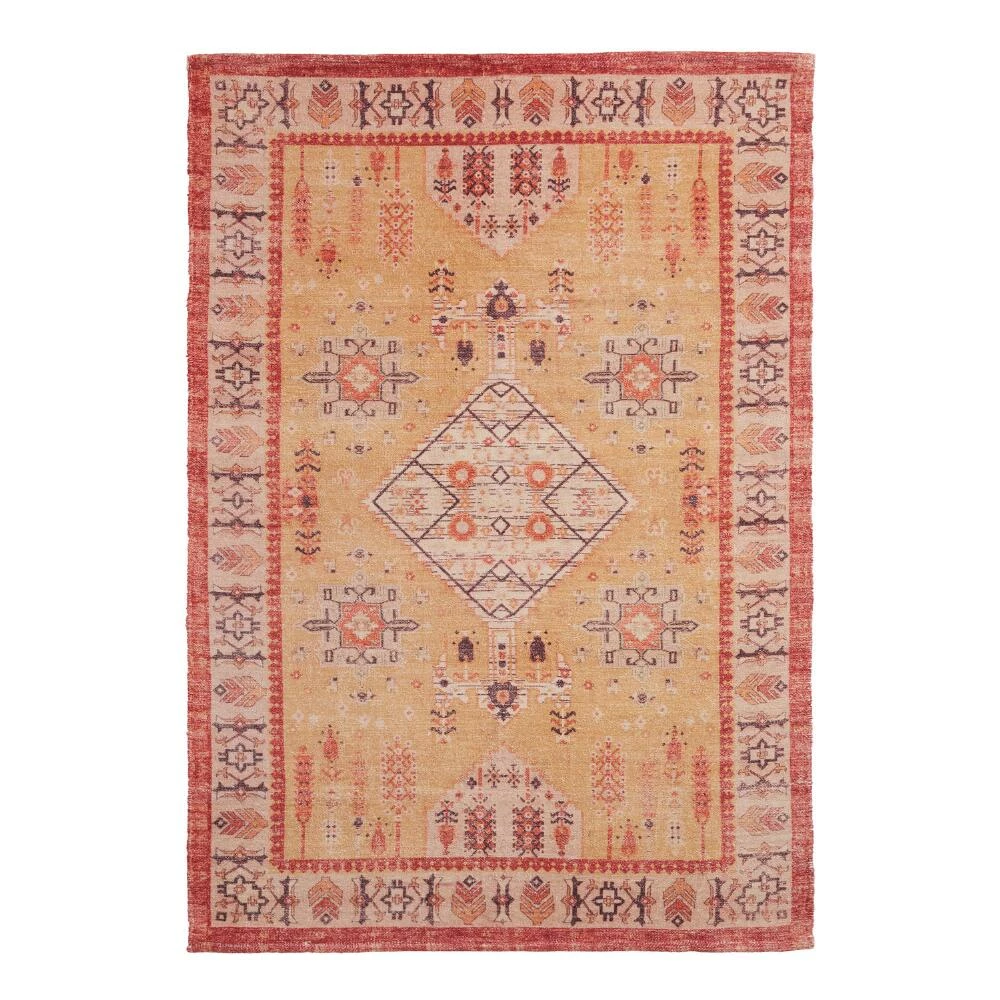 Handwoven of natural cotton with a silky chenille texture in warm desert hues, the Taos 4×6 washable area rug is a perfect high-traffic foundation for family homes. Its timeless motifs are presented in distressed rust, orange and golden-yellow hues with a dynamic patterned border. The ultimate easy-care rug for homes with pets and children, you can just toss it into your washing machine to take care of any mess.