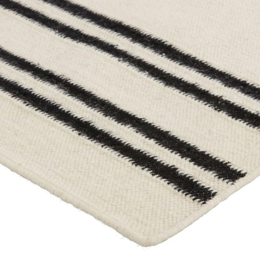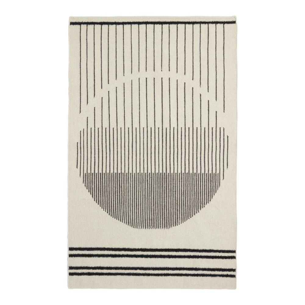 Featuring a bold design inspired by Bauhaus style, our 5×8 Tribeca area rug is handwoven of thick wool in sophisticated ivory and black hues. A perfect accent for urban and modern settings, this unique kilim creates an arresting visual flow with its interplay of circular form, wavy broken horizontal stripes and dramatic vertical-striped borders.