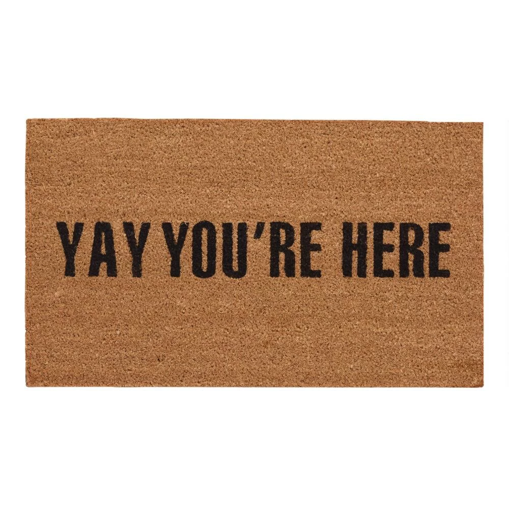 Our natural fiber doormat has a way with words, letting guests know exactly how you feel about their arrival. Made of unbleached coir, our mat is scripted with the words “Yay You’re Here,” in a black font.